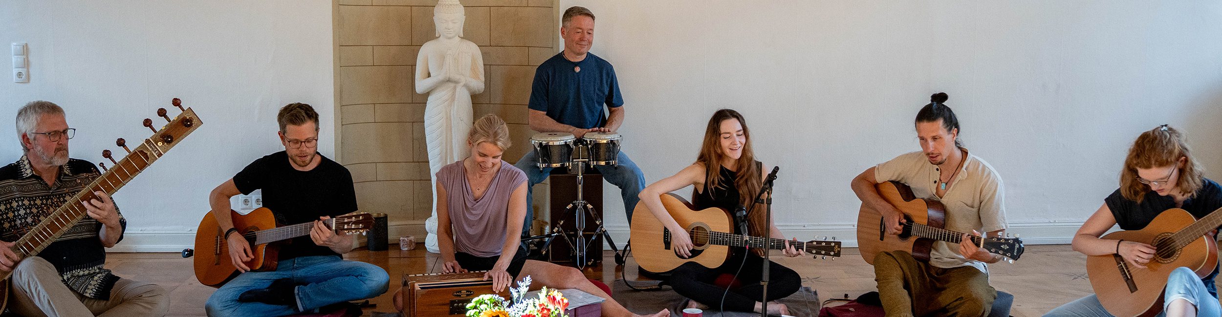 Wir treffen uns regelmäßig bei uns im Studio zum gemeinsamen Musizieren und kommen auch manchmal anderswo zusammen, wie z.B. beim Yoga Festival Braunschweig im KULT-Theater im Schimmelhof. Auch bei unseren Bühnenauftritten geht es nicht um Performance, sondern um Community und Co-Kreation – wir lassen das alles gemeinsam mit euch entstehen!